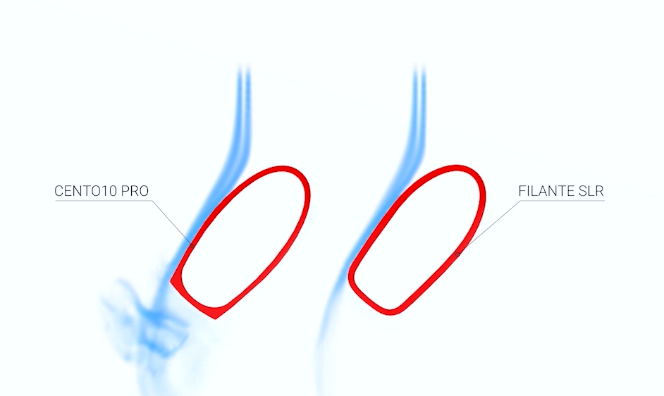 從標準的 NACA 翼型 / KAMM 尾部 開始,管型設計不再有鋒利的邊緣,即使氣流受到干擾,圓滑的角度也能提高性能。而前叉內側間距加寬 7mm,比 Cento10 PRO 寬 13.6%,讓氣流順暢通過,使風阻更低,優化空氣動力學。