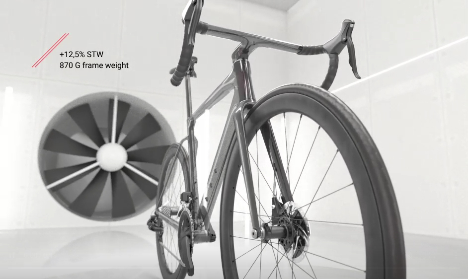 全新管型設計使車架重量得以減少。由於少了尖銳邊緣,所需使用的材料更少,減去額外重量後,不僅提高內部的均勻性,也使車架的重量減少到 870g (size M),一級套件的整車重量也能控制在 6.8kg 內。