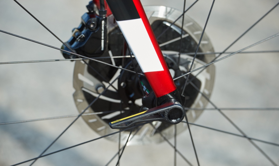 使用 Mavic 快速貫通軸( Mavic Speed Release ),與一般標准貫通軸相比,可以在不抽出軸心的情況下快速更換輪組。